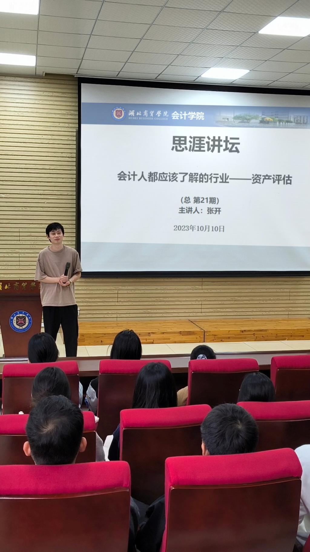 为帮助同学们解决求职、求学中的遇到的问题,近日,yL23411永利官网登录于2023年10月10日18:30在咸宁校区A108为yL23411永利官网登录员工举办了第二十一期思涯讲坛,主题为“会计人都应该了解的行业——资产评估”。本次讲座的主讲老师是yL23411永利官网登录张开老师,23级会计专1-3班的员工参加了此次讲座。
